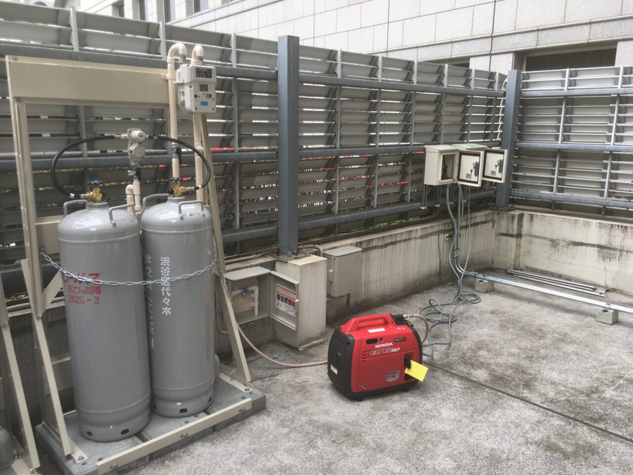 災害時の避難所用電源について、これまではガソリンを利用するタイプの発電機を備蓄していました。しかし、帰宅困難者への対応として72時間稼動させるためには大量のガソリン備蓄が必要となり、貯蔵に際しては危険物保管庫が必要となります。そこで、燃料の保管が簡単で72時間の継続利用が可能な低圧LPガス発電機(1.5KVA)の導入を決めました。また、屋外に設置する発電機から直接電気を供給できる専用のコンセントを設置しています。このコンセントを利用して、避難場所の仮設照明、携帯電話や可搬型蓄電池への充電することを想定しています。
